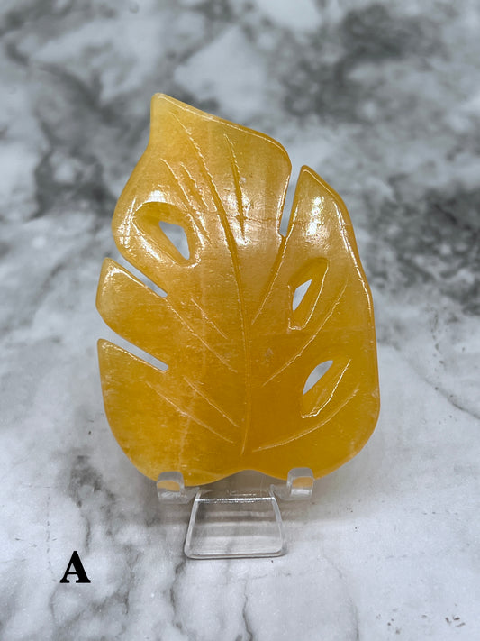 Yellow Calcite Monstera Leaf Carving