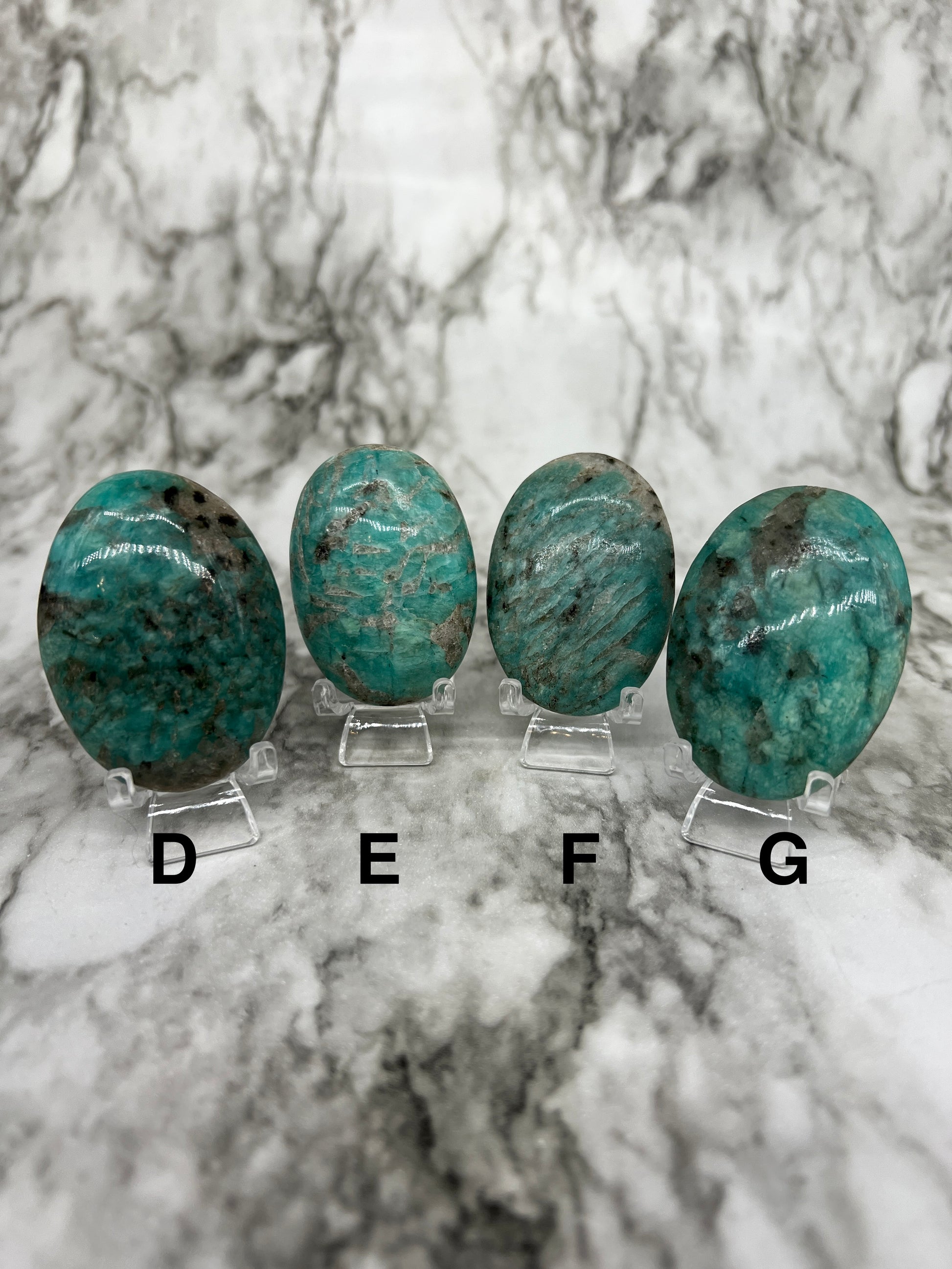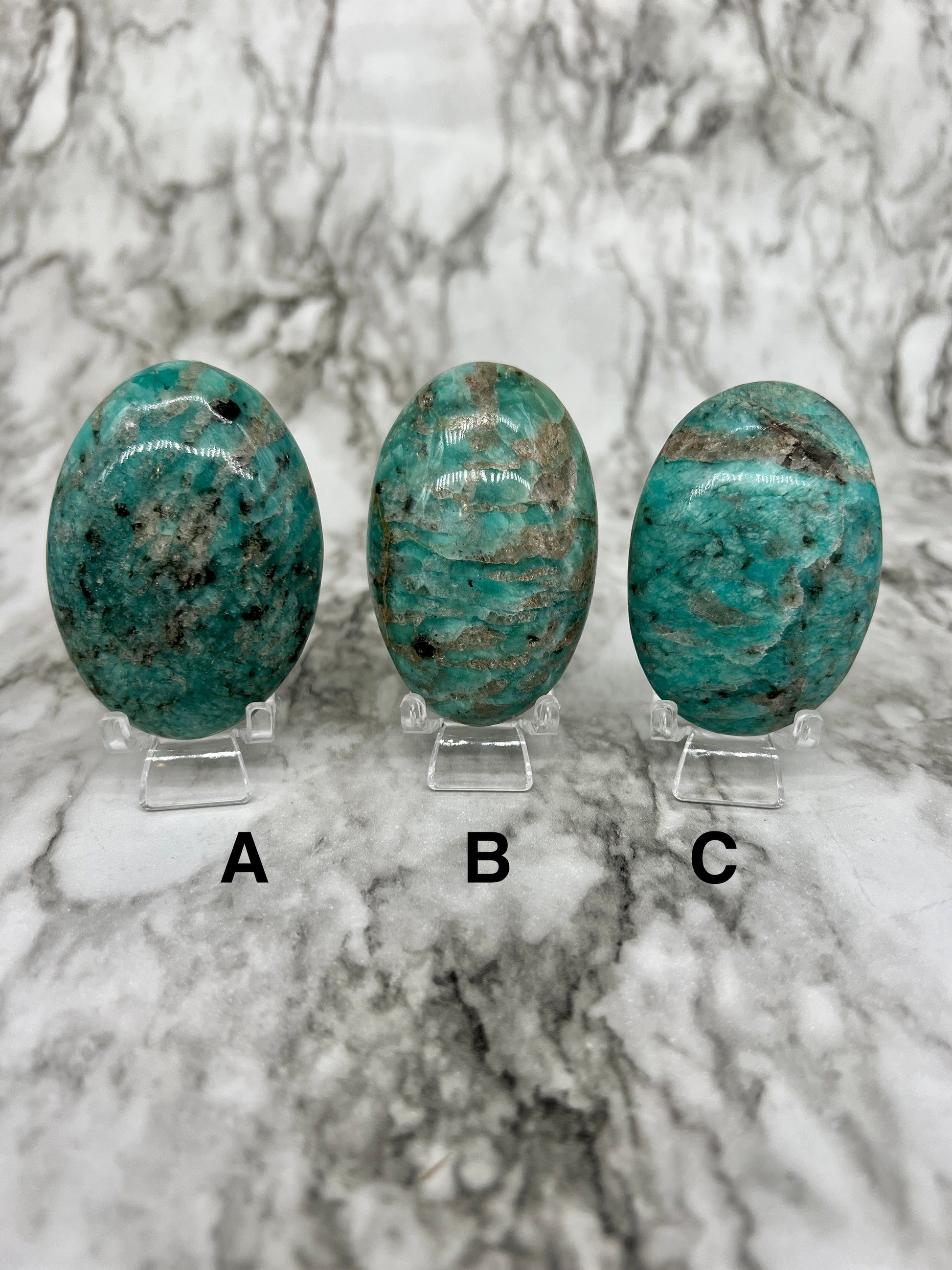 Immerse yourself in the harmonious energy of our Amazonite & Smokey Quartz Palm Stone. Carefully crafted, this palm-sized treasure combines the tranquil vibes of Amazonite with the grounding essence of Smokey Quartz. Amazonite, renowned for its calming properties, fosters serenity and balance, while Smokey Quartz enhances clarity and protection, shielding you from negativity. Perfectly shaped for effortless carrying or meditation, this palm stone fits snugly in your hand, serving as a constant source of comfort and strength. Let its soothing touch ease your worries and invite positivity into your life. Whether kept in your pocket, displayed on your altar, or used during healing practices, the Amazonite & Smokey Quartz Palm Stone offers a tangible reminder of peace and resilience. Embrace its energy and embark on a journey of inner tranquility and empowerment.